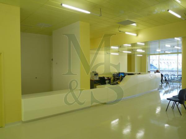 Habillage mural en résine pour liaison avec banque d'accueil principale et support du portillon.